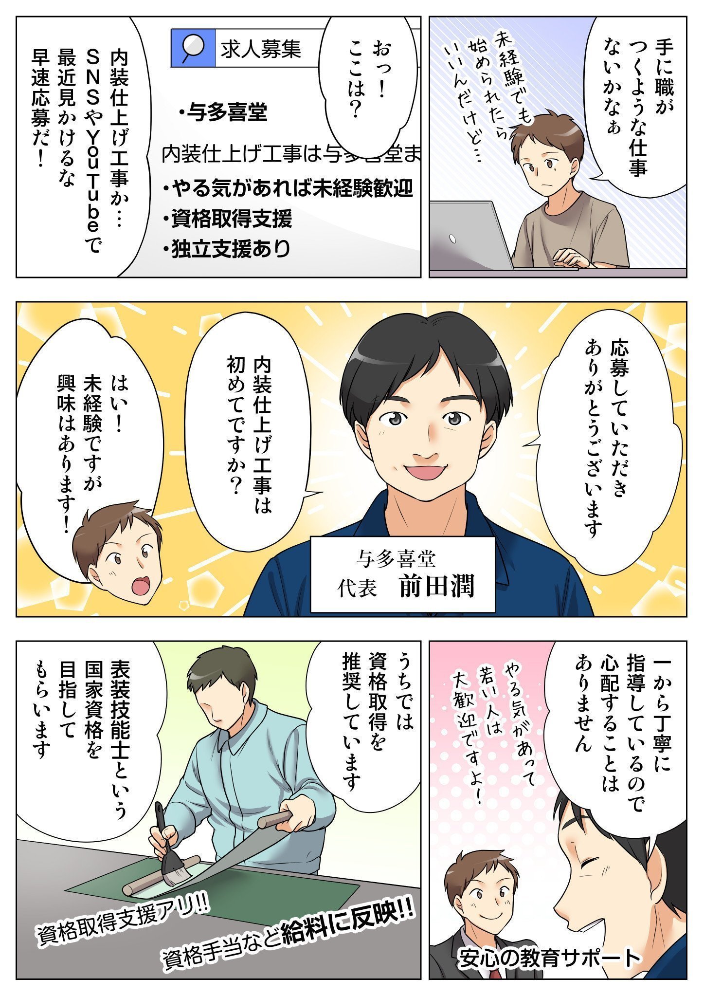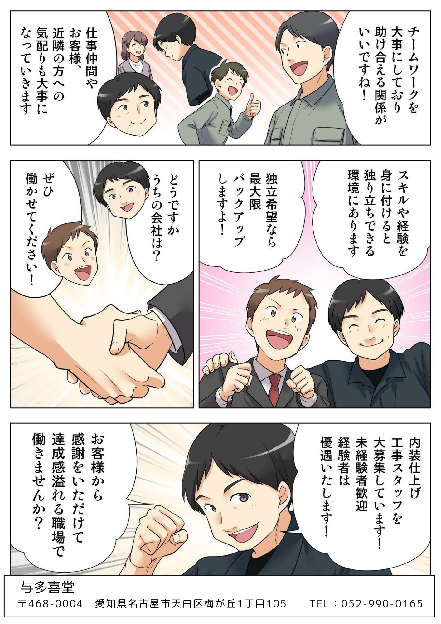 工事現場は裏方仕事であるため、お礼を言われる機会がほとんどありません。しかし、与多喜堂では内装仕上がりを担当しているので、お客様の反応やお礼、激励を直接いただける機会に恵まれています。やりがいのある仕事を一緒に手掛けてくれる方を募集しています。